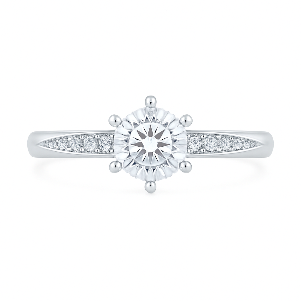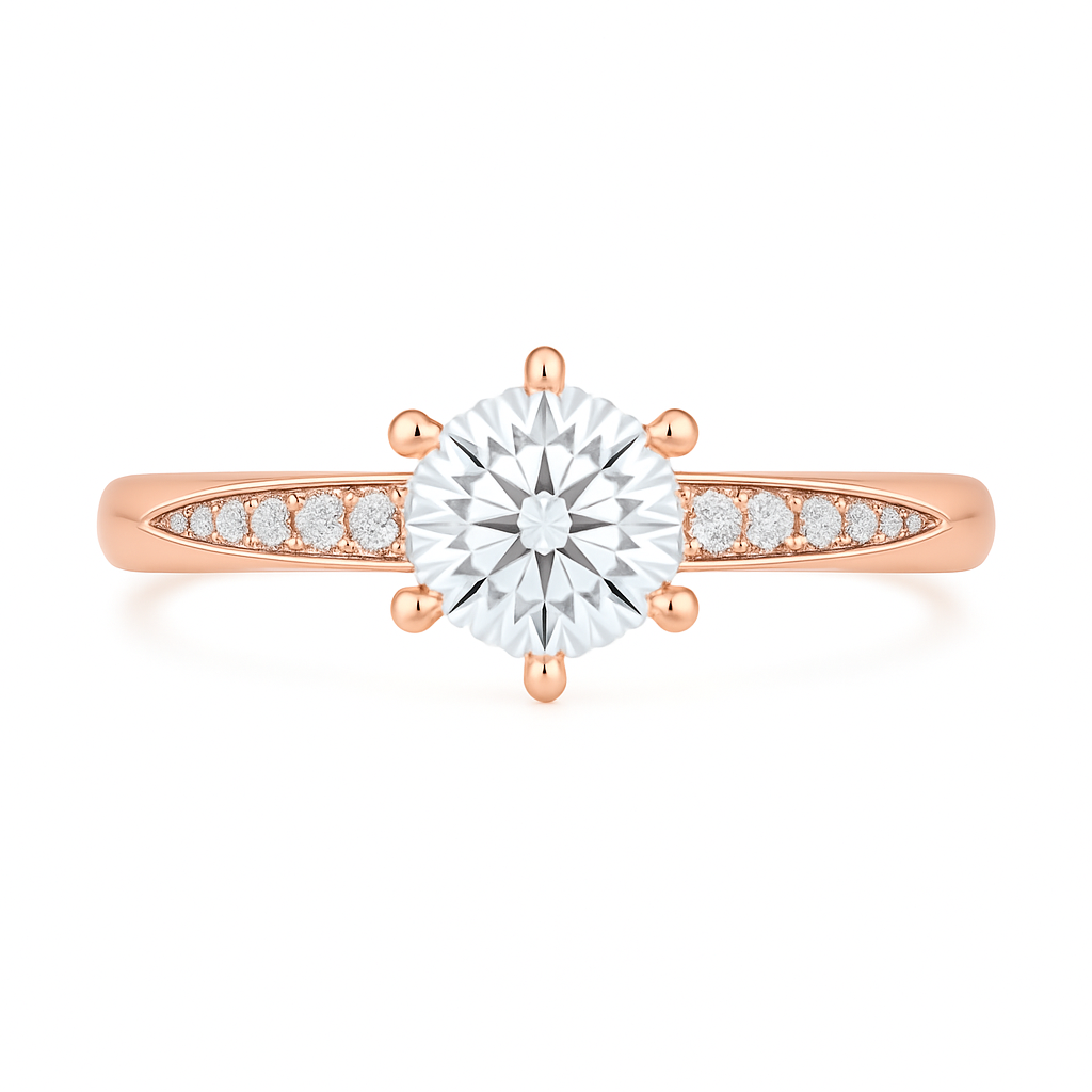 Alina means “light,” and she carries that spirit into every detail — a symbol of the warmth and clarity that comes from starting with intention. This six-prong solitaire features a brilliant round moissanite center, gently held in a classic setting that feels as timeless as your promise. Along the tapering rose gold band, a subtle row of accent stones adds just the right amount of shimmer.