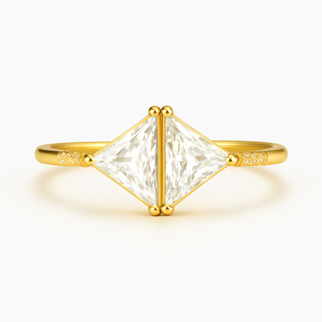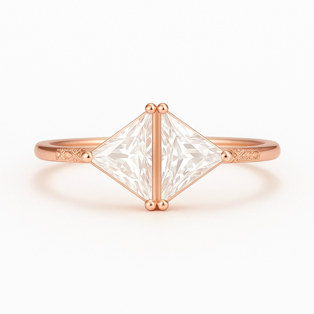 Annie is a ring that celebrates the beauty of balance and the magic of meaningful beginnings. Set with two mirrored kite-cut moissanites, each stone reflects the other — a perfect representation of two lives coming together, distinct yet deeply connected. The vertical bar between them is more than just design; it’s a symbol of shared values and the promise to grow side by side. Annie was made for those who want something poetic, modern, and refreshingly different.