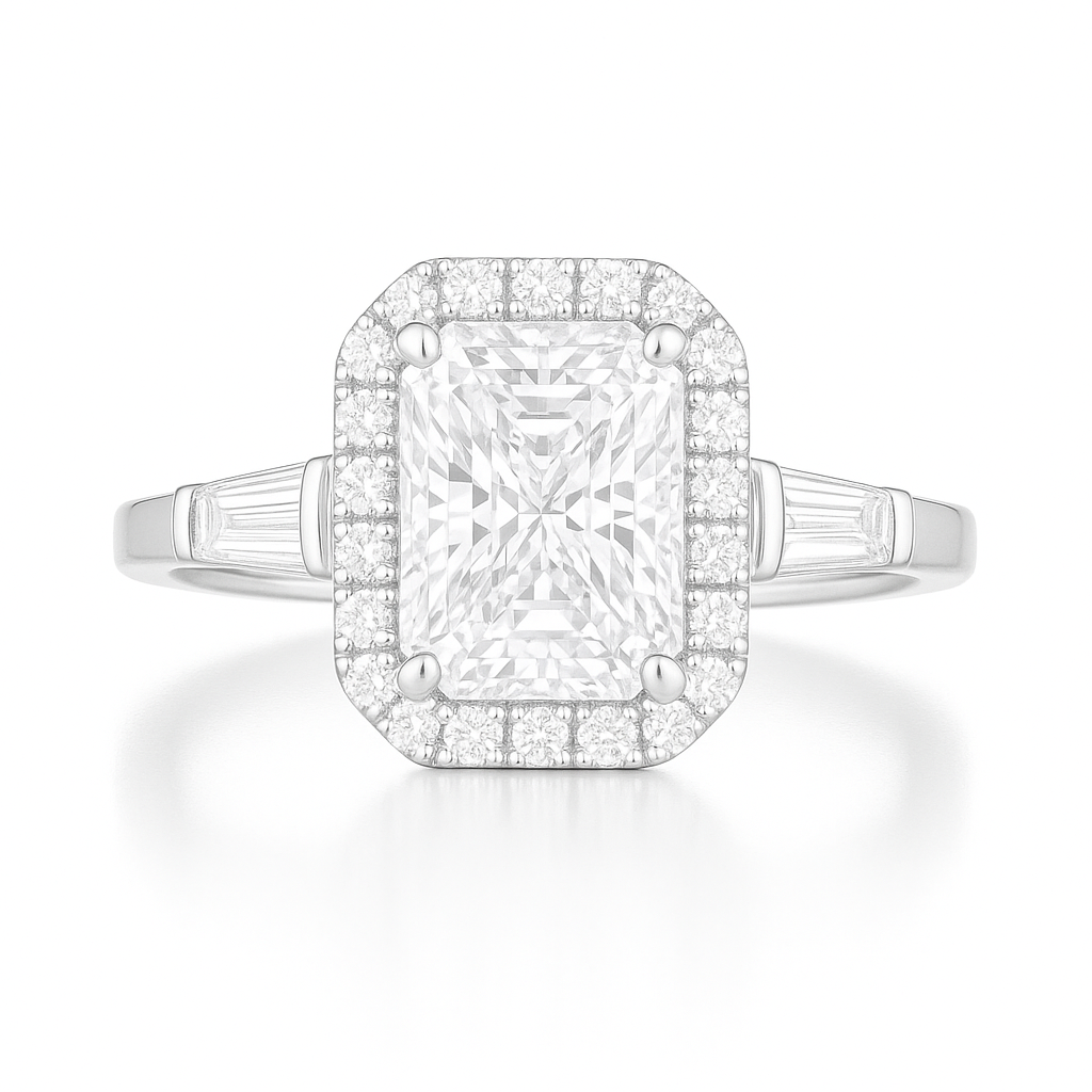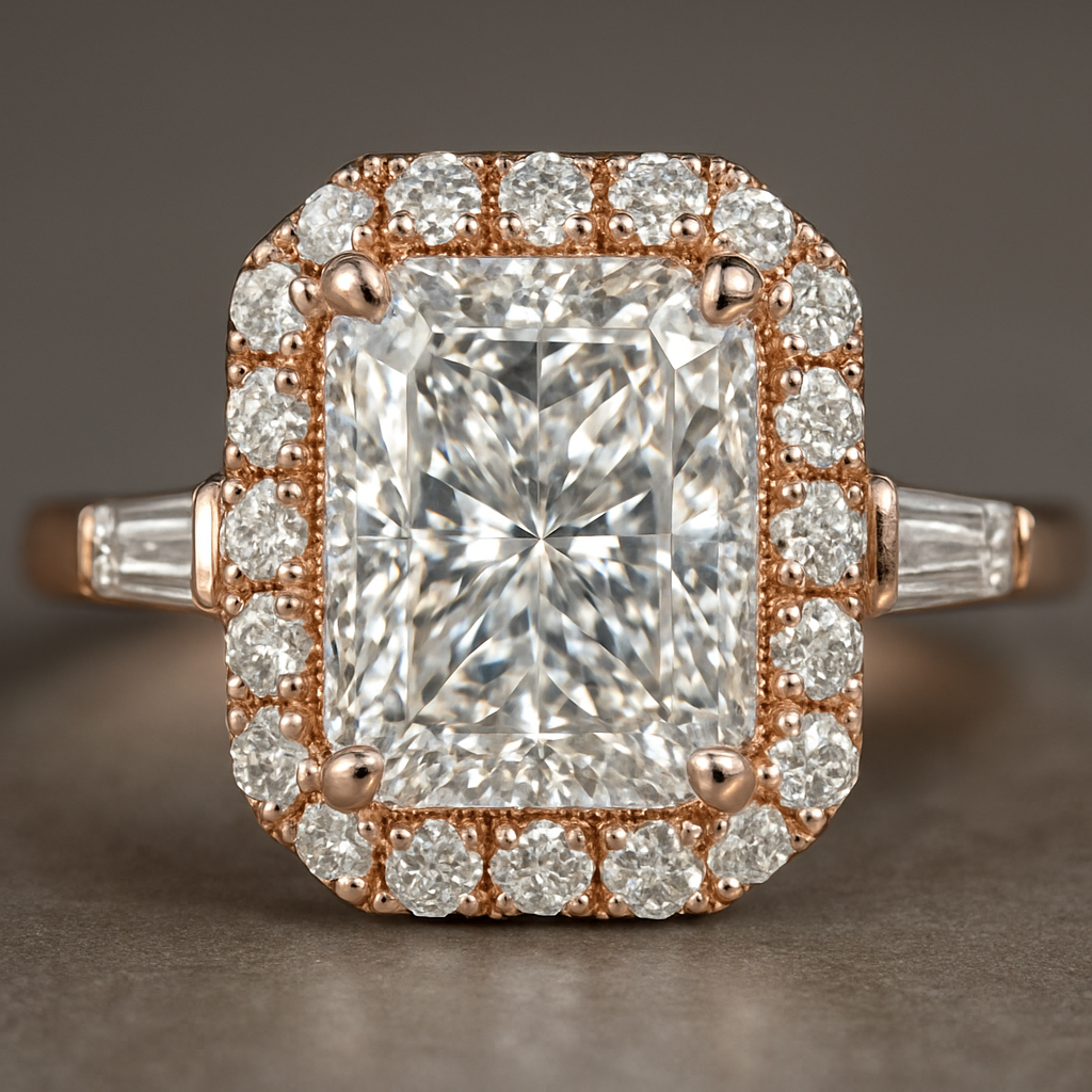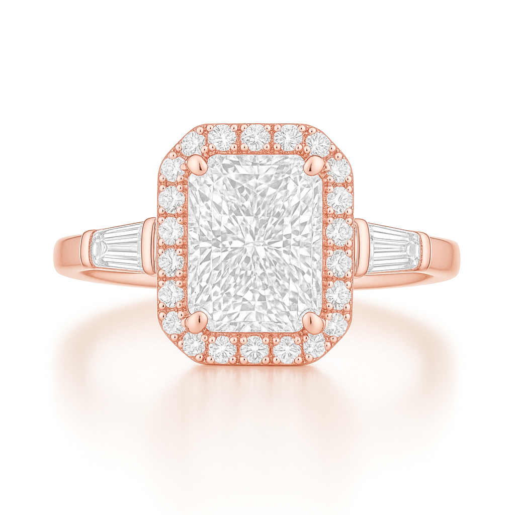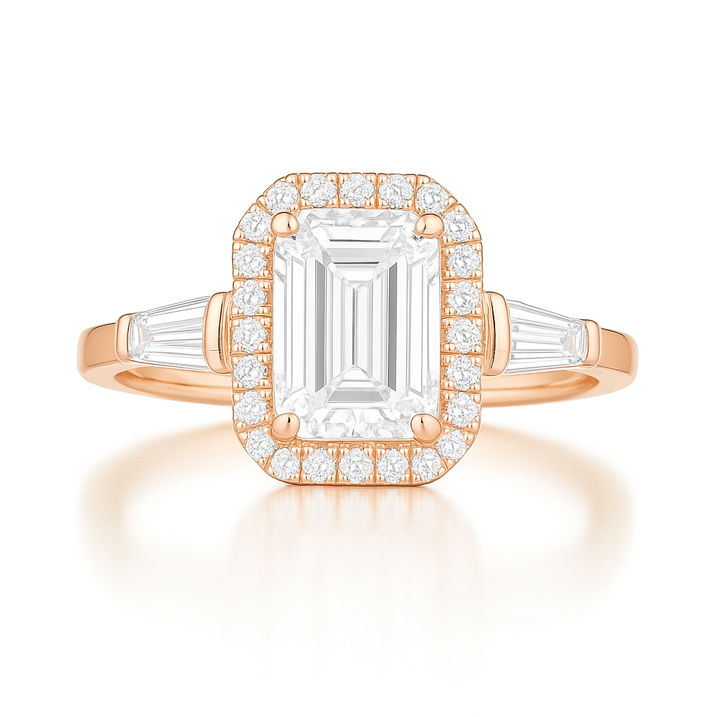 A delicate halo of fine round diamonds enhances the center, while tapered baguettes on either side lead into a graceful 14K rose gold band. The silhouette is refined yet powerful—an heirloom in the making.