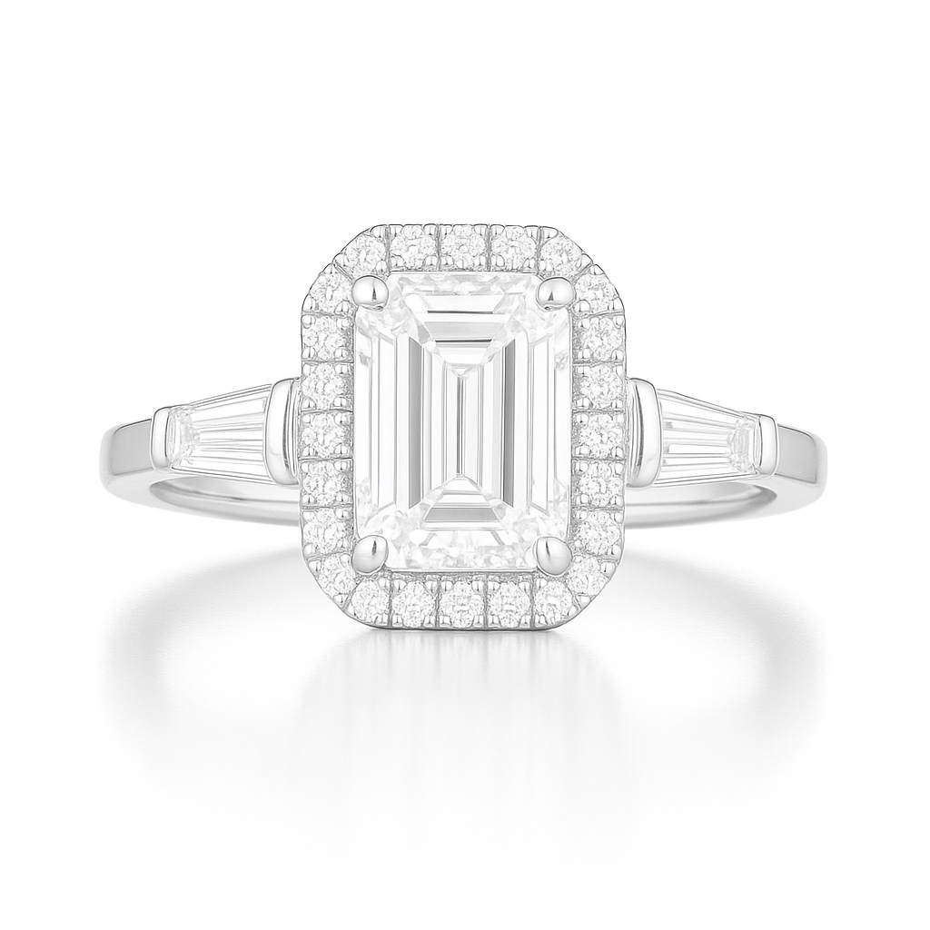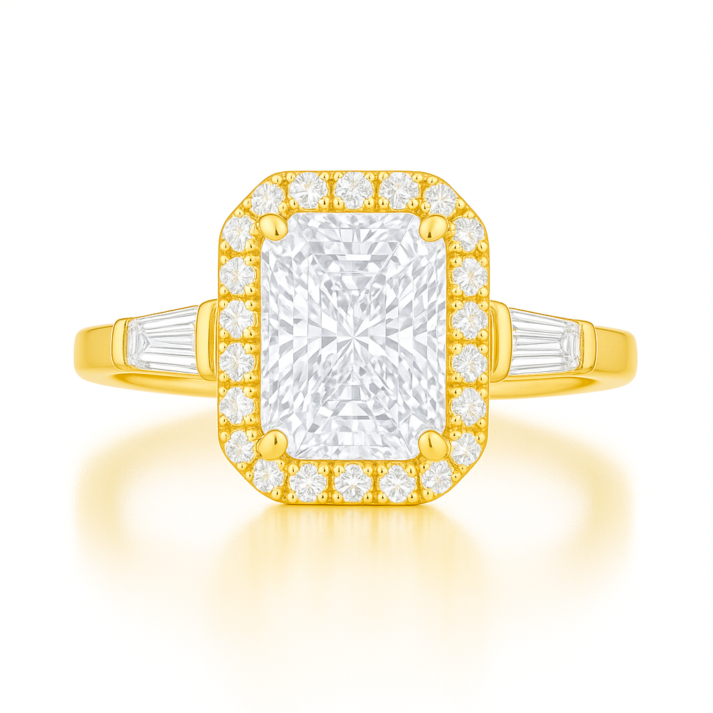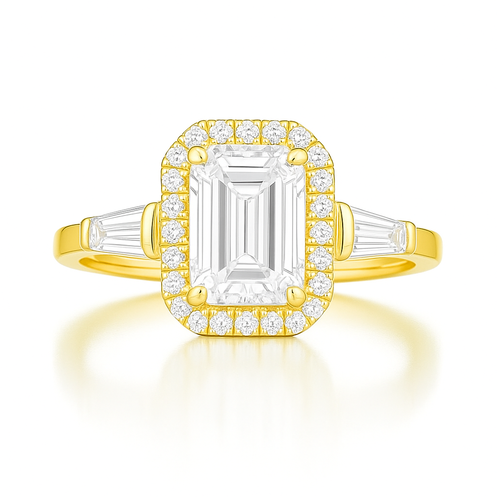 Choose your center stone (emerald or radiant cut) in lab-grown or natural diamond. This design is available in 14K/18K gold (rose, yellow, or white) or platinum. Each ring comes with a CAD preview and personal design guidance to bring your exact vision to life.