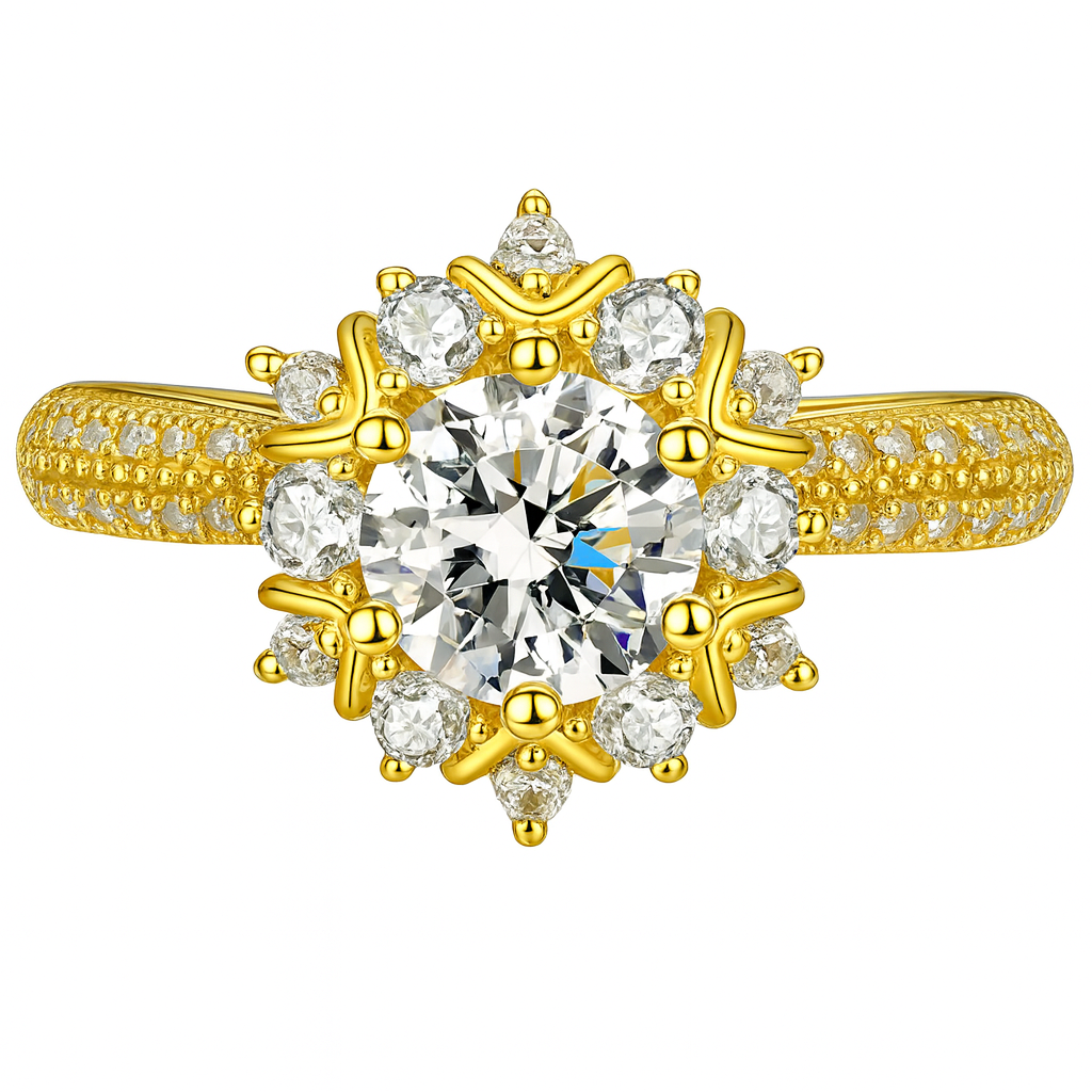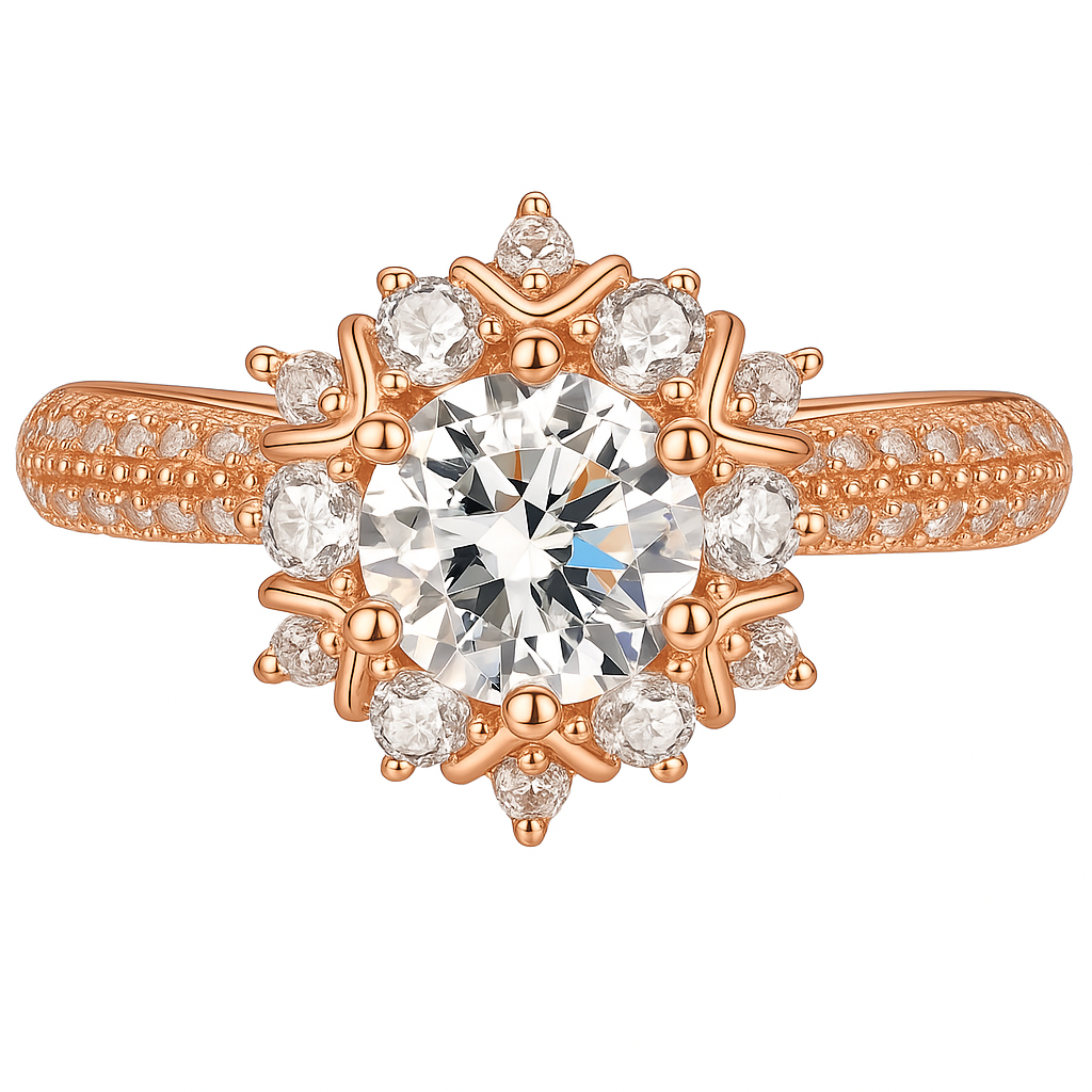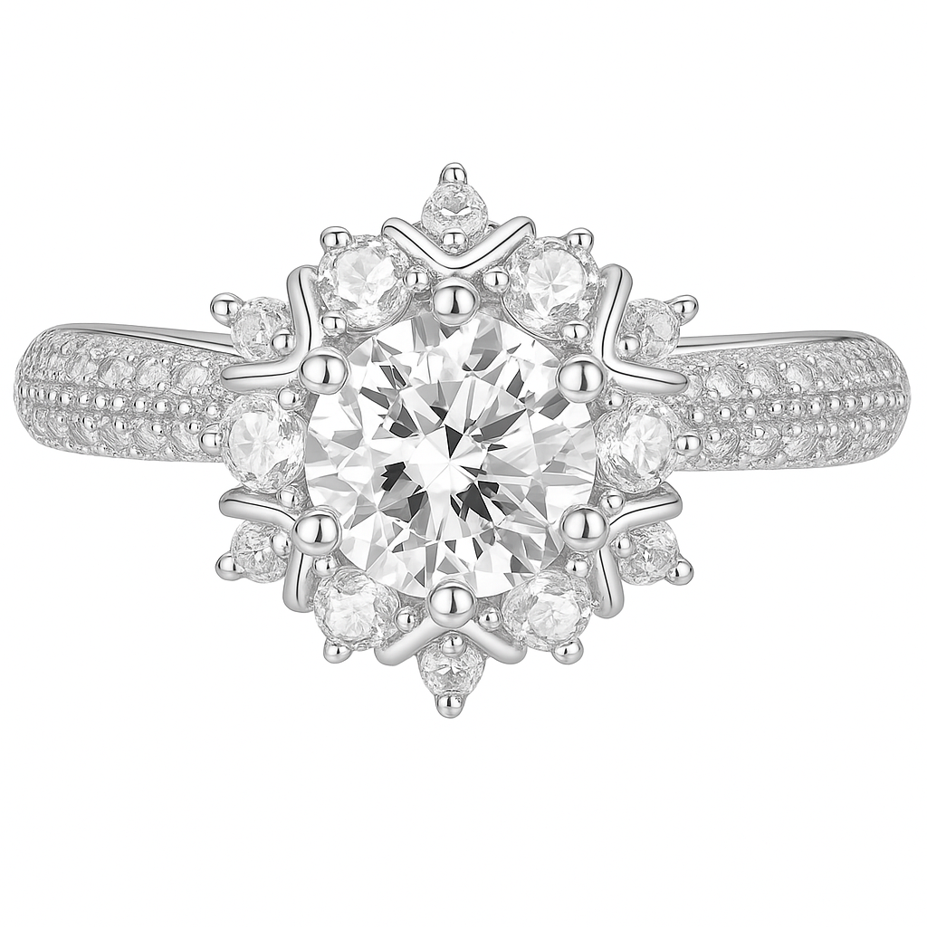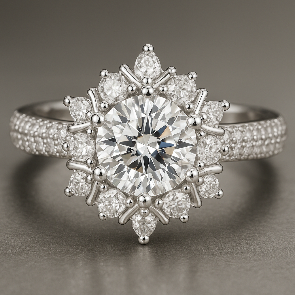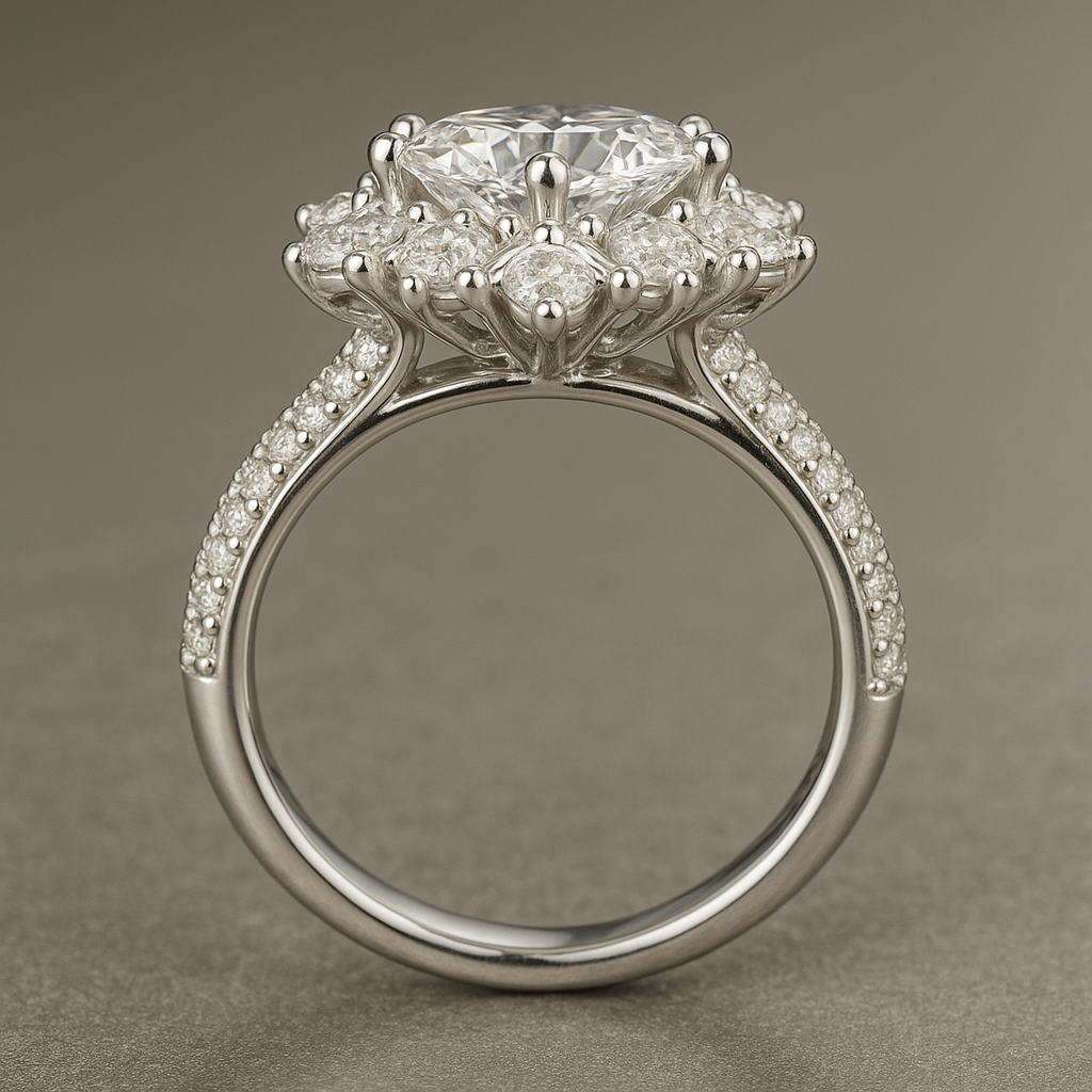 Born from winter’s most delicate snowflake and summer’s first blossom, Caeloria is a breathtaking composition of elegance and symbolism. A luminous round center stone radiates from a halo of pear-shaped diamonds, like petals in a celestial bloom — each one meticulously hand-set to echo grace, balance, and eternal promise.