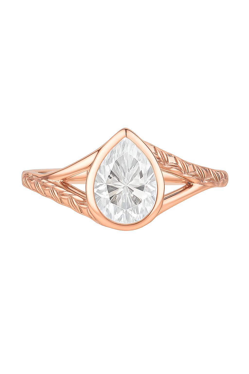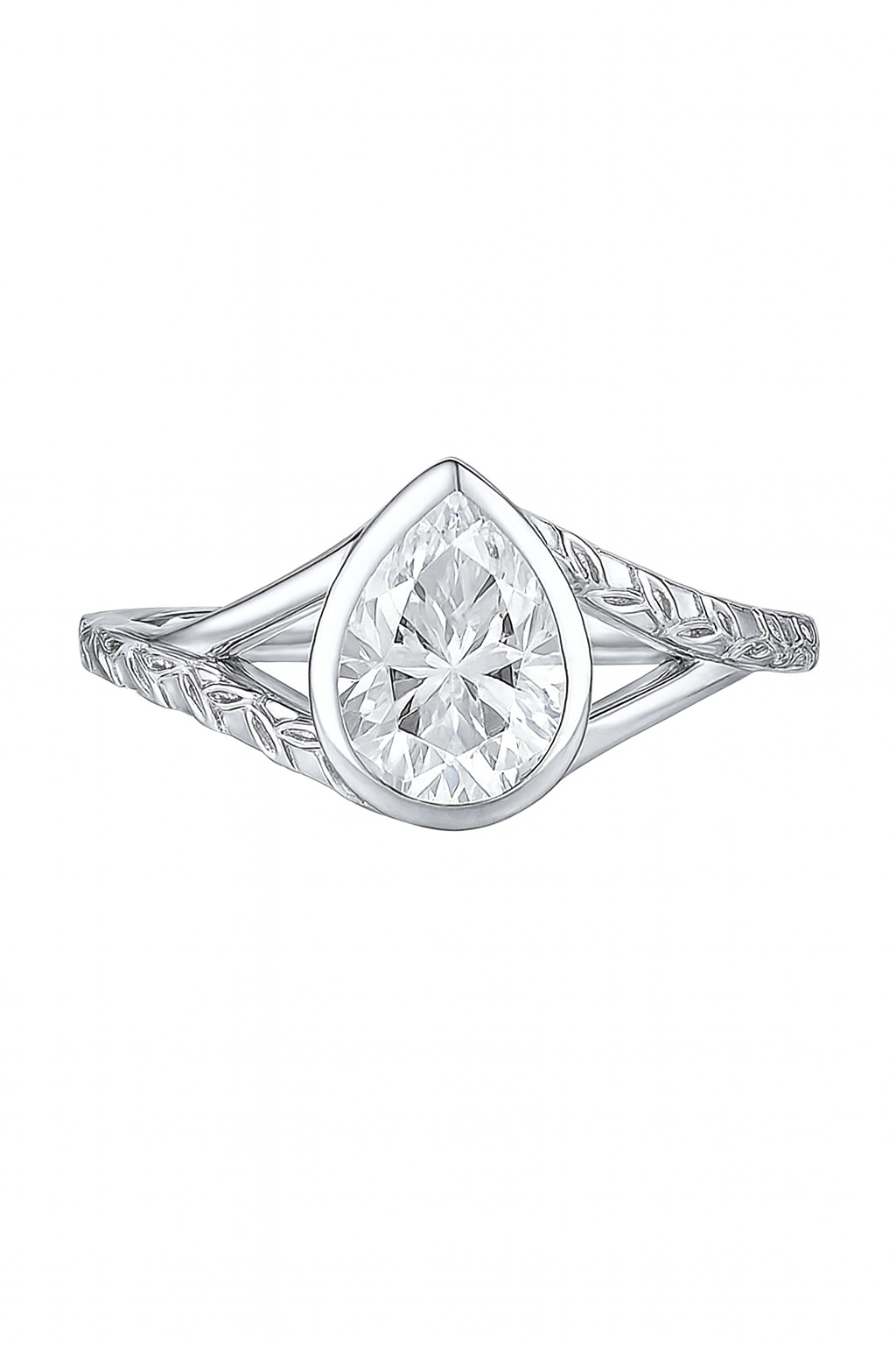 Like the first buds of spring, Coralie carries a quiet beauty that grows richer with time. The pear-shaped center stone, cradled in a graceful split band with delicate leaf engravings, captures the feeling of love at its very beginning — fresh, hopeful, and full of promise. Her name, French for “coral,” hints at treasures found beneath the surface, waiting to be discovered and cherished.