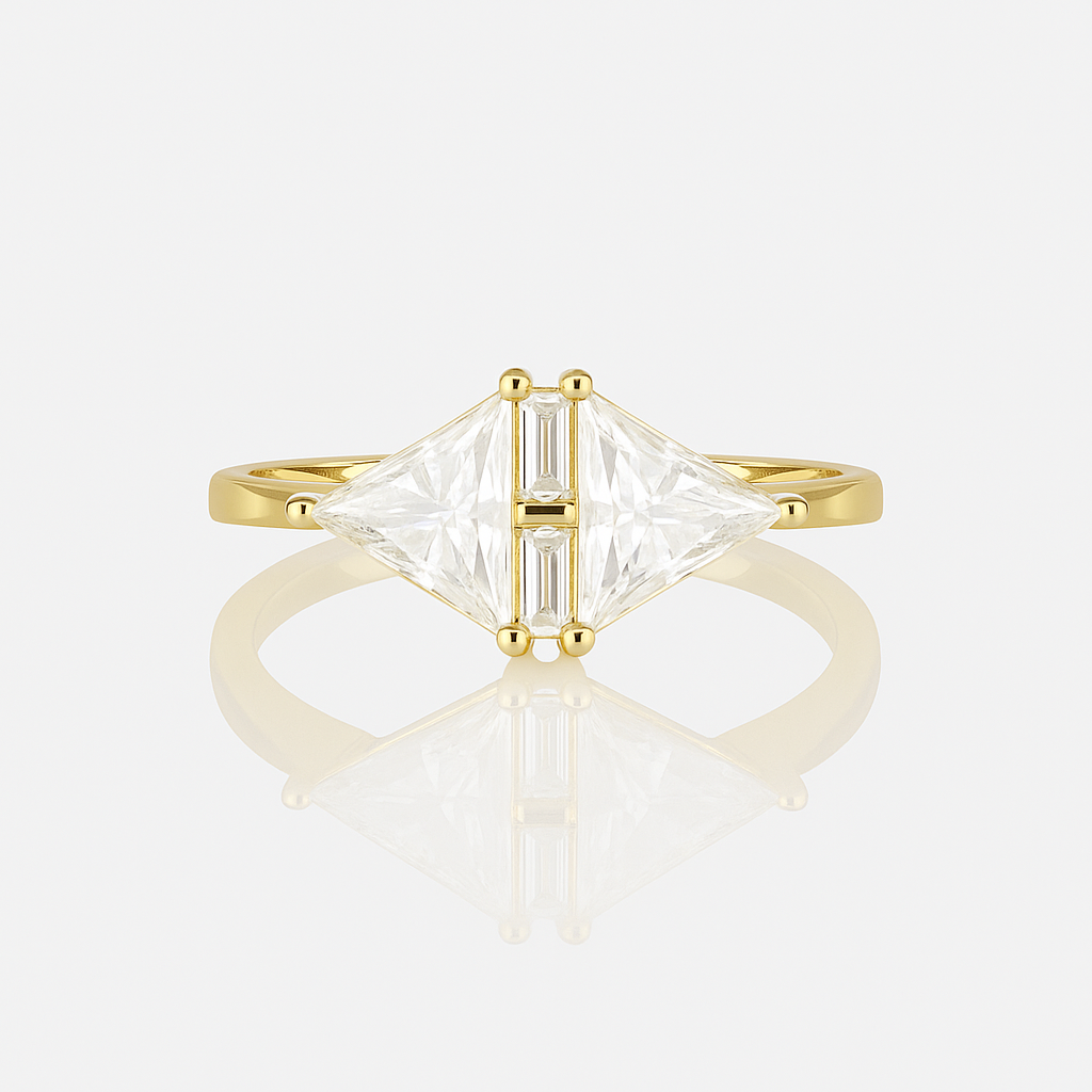 14K solid gold with a 1–2 ct lab-grown diamond center stone and tapered baguette diamond side stones.