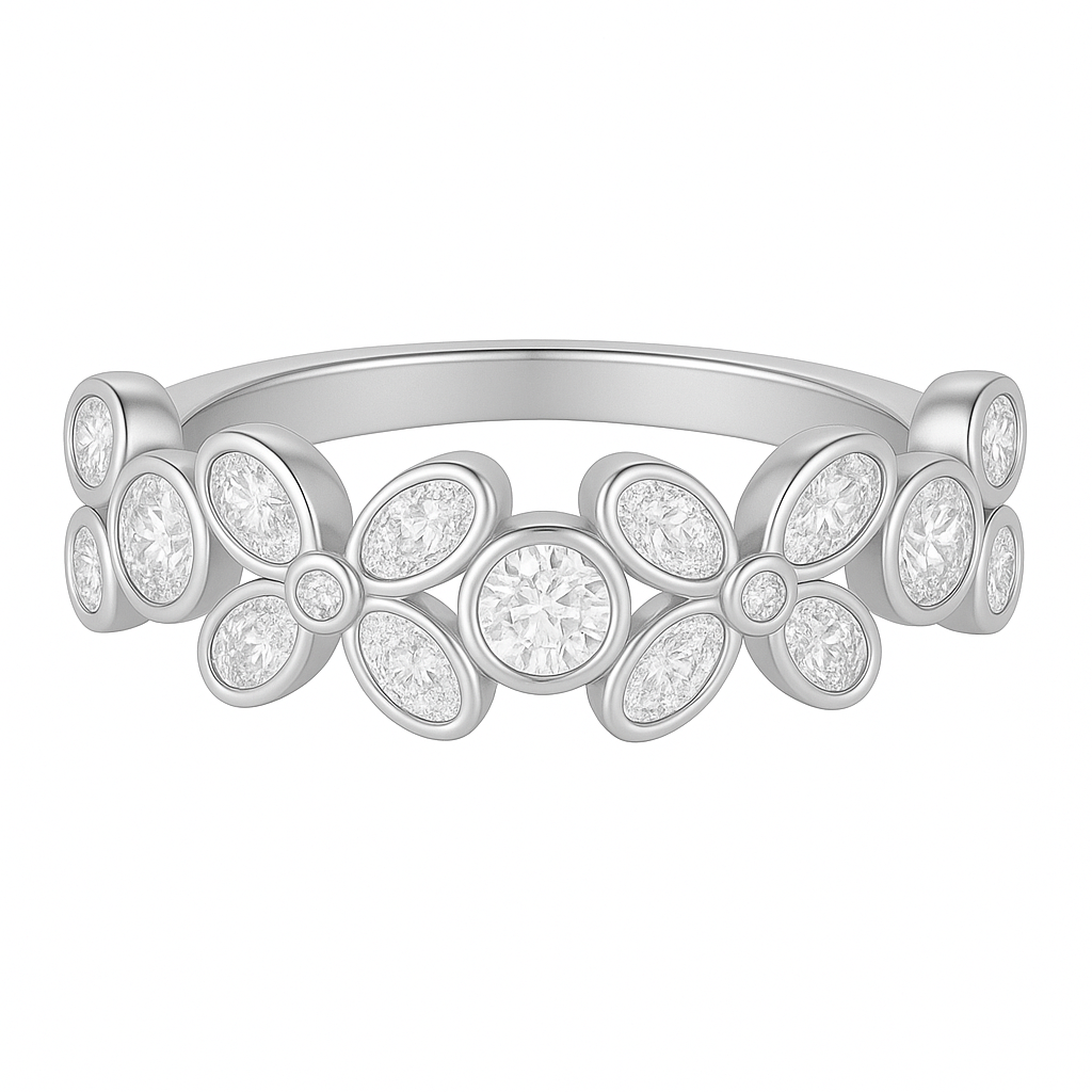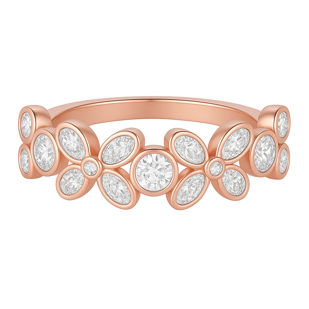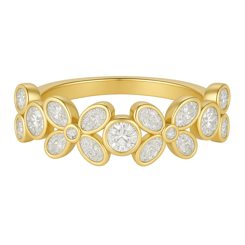 The name Fluer is a romantic twist on the French word fleur, meaning "flower." Inspired by vintage French floral tiaras and Art Nouveau botanical patterns, this ring honors timeless elegance through modern craftsmanship. The bezel settings not only enhance durability but soften the sparkle into a glimmer that feels intimate and warm — like sunlight caught in lace.