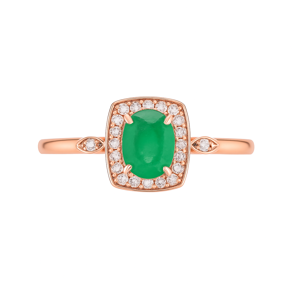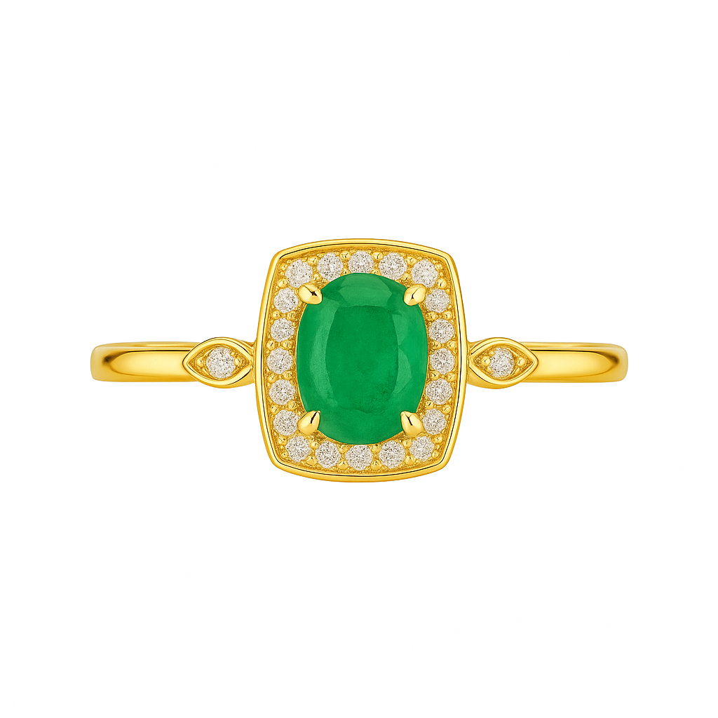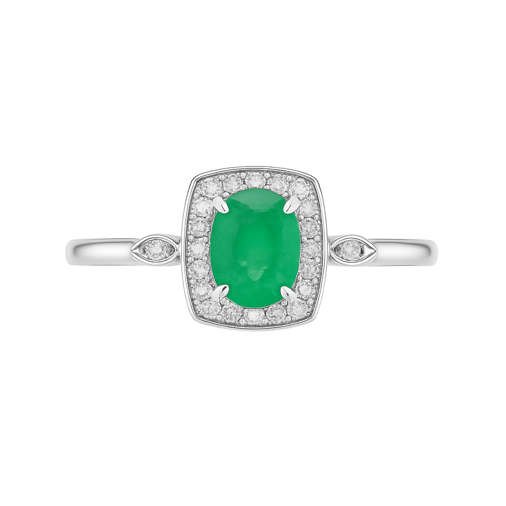 A ring worthy of the name Isabelle, this design radiates elegance that feels both storied and fresh. At its heart lies a lush oval-cut emerald, chosen for its vivid green hue and natural depth — a color once treasured by royalty and believed to bring harmony and renewal to its wearer. Surrounding the center stone, a halo of hand-set brilliant diamonds captures and reflects the light with every movement, while two marquise diamonds on either side add a graceful, elongated silhouette to the design.