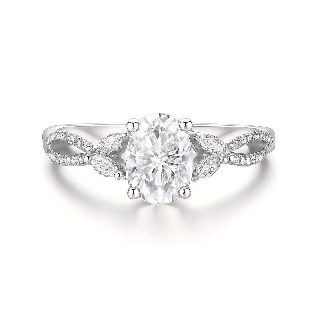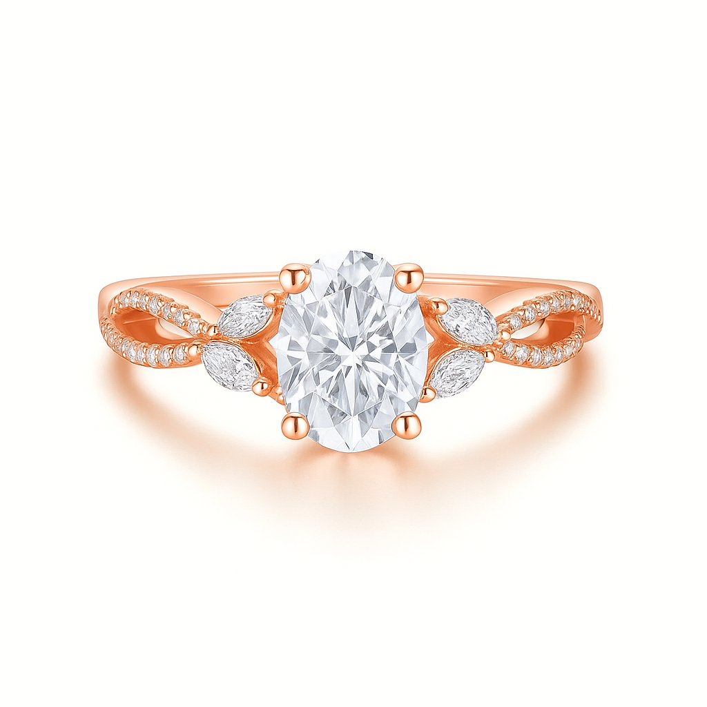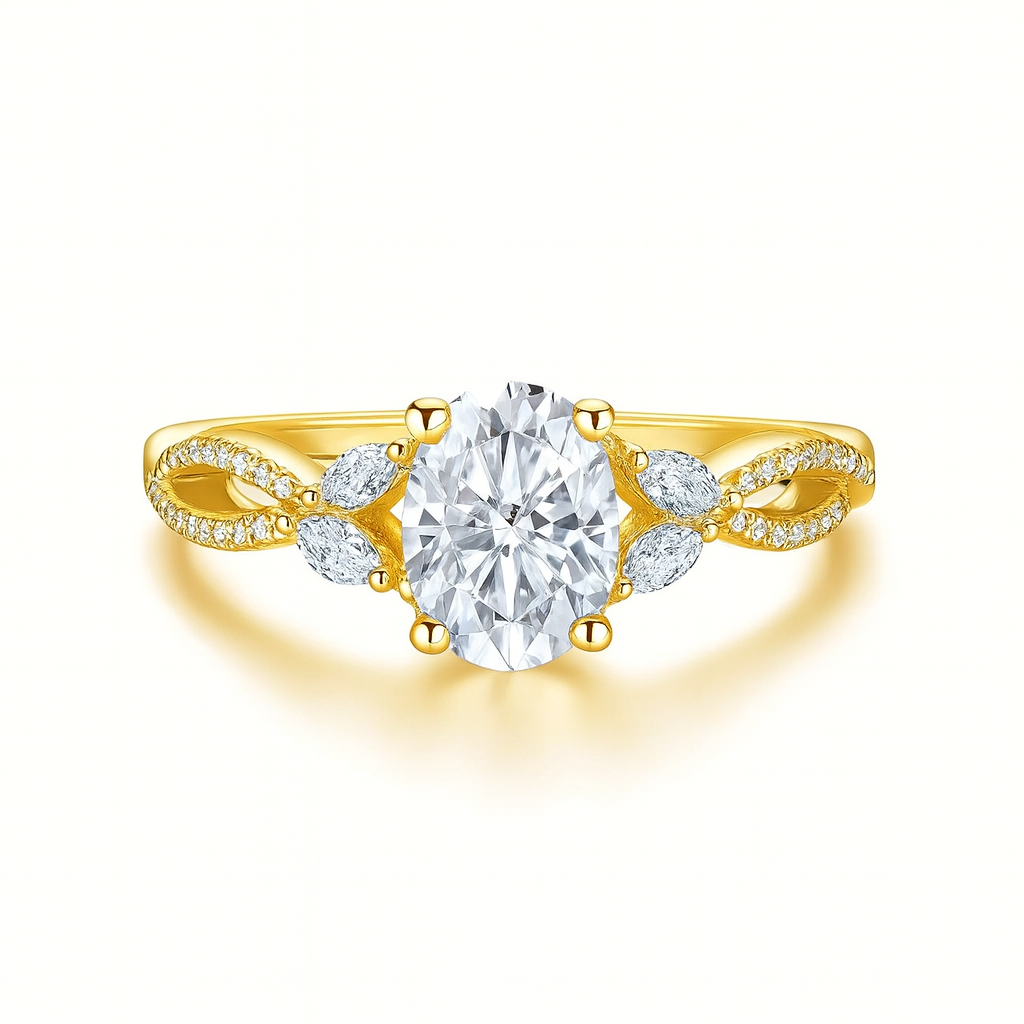 Solid 14K gold with an oval-cut moissanite, marquise side stones, and pavé-set moissanites. Offers rich luster and heirloom-worthy craftsmanship while keeping your budget intact.