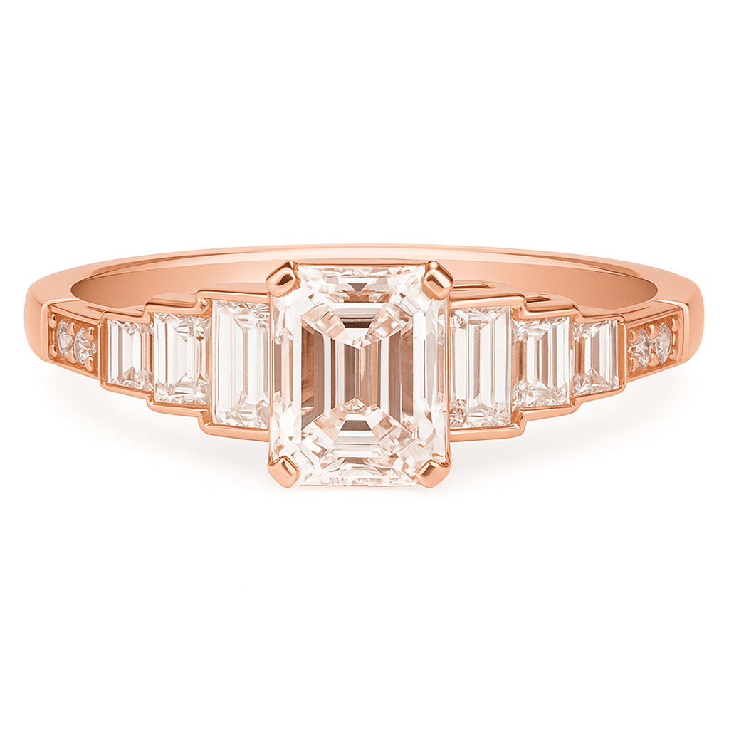 Clean. Composed. Courageous. Lumière is a radiant symbol of clarity in uncertain times—a reminder that love is worth building even when budgets are tight. Centered with a commanding emerald-cut moissanite, this design is framed by ten precision-cut baguettes and a polished band that gently narrows toward the center, drawing your eye toward what matters most.
