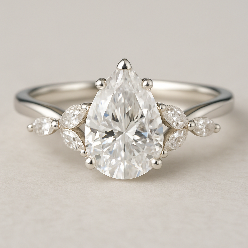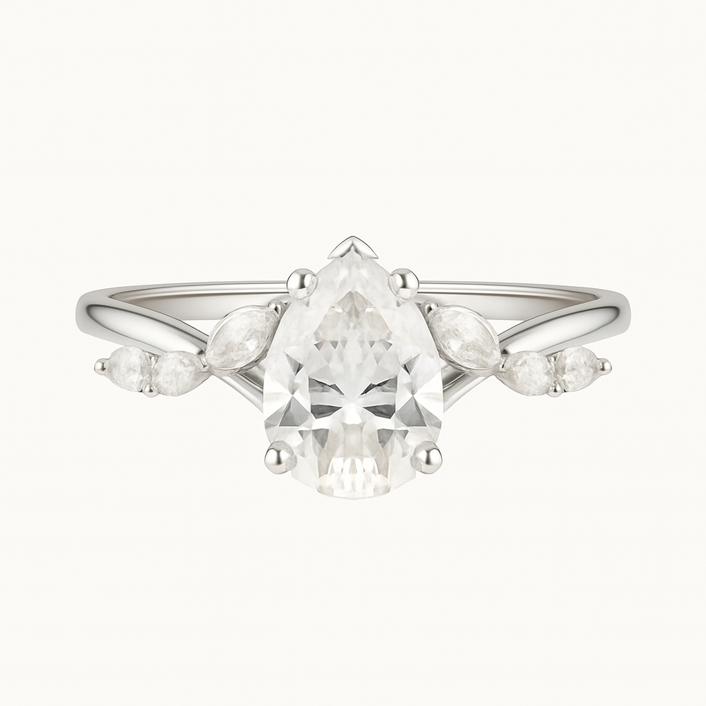 Sterling silver band with your choice of rhodium, yellow gold, or rose gold plating. A 1.5–2.0 ct pear-cut moissanite center with marquise-cut accents. Elegant, meaningful, and ready to grow with you.