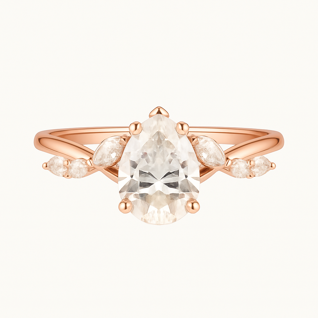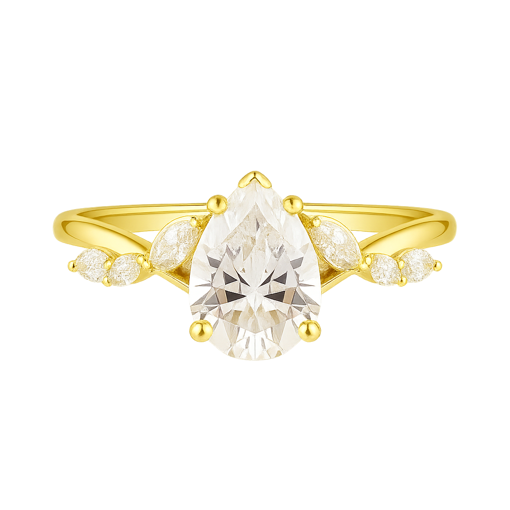 Solid 14K gold (yellow, white, or rose) with a 1.5–2.0 ct premium pear-cut moissanite and six marquise-cut side stones. Durable and timeless — perfect for a love that’s going the distance.