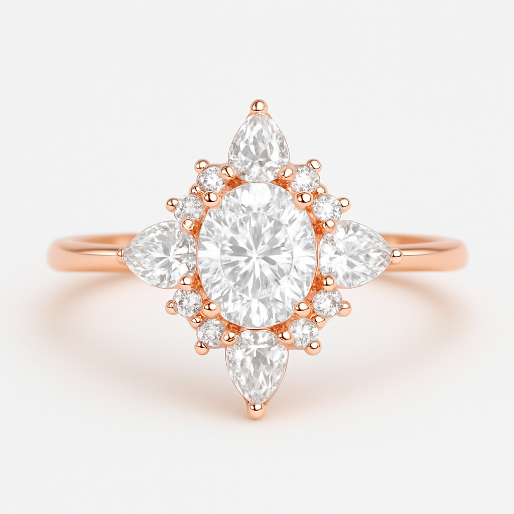 Like spring’s first light over a quiet French countryside, Maelis evokes the kind of love that grows gently, but with purpose. Her centerpiece—an oval-cut moissanite—glows like morning dew, framed in a halo of marquise and round stones that bloom outward like petals. Set in your choice of glossy white, yellow, rose gold, or sterling silver, Maelis is for the one who knows that Day One should feel as unforgettable as “I do.”
