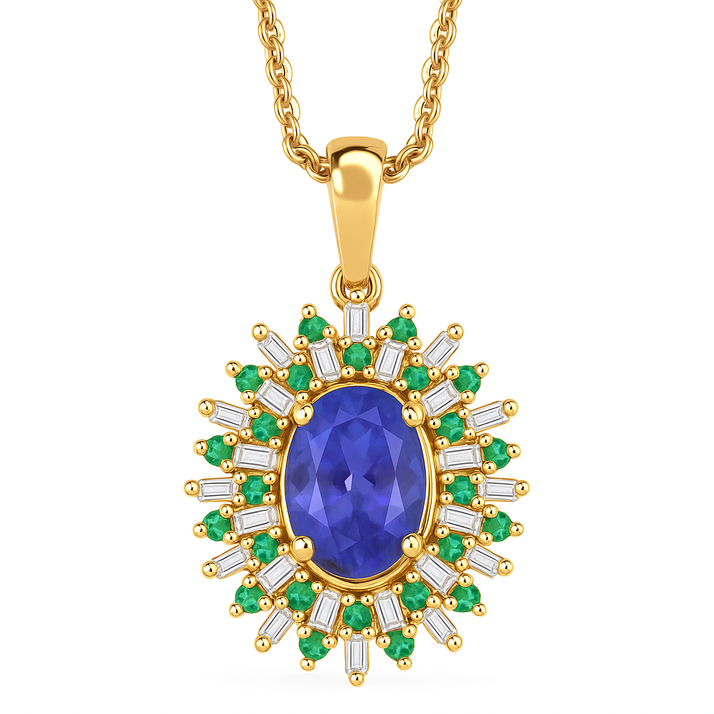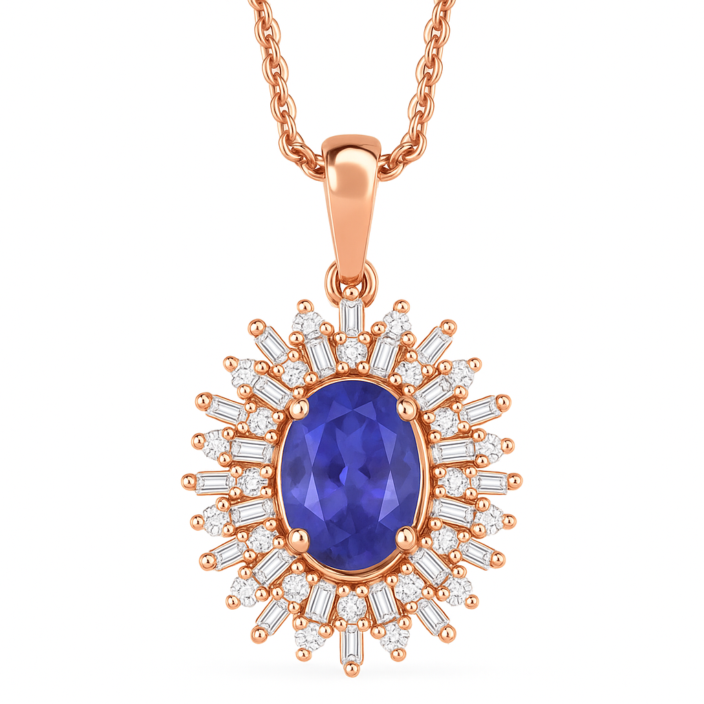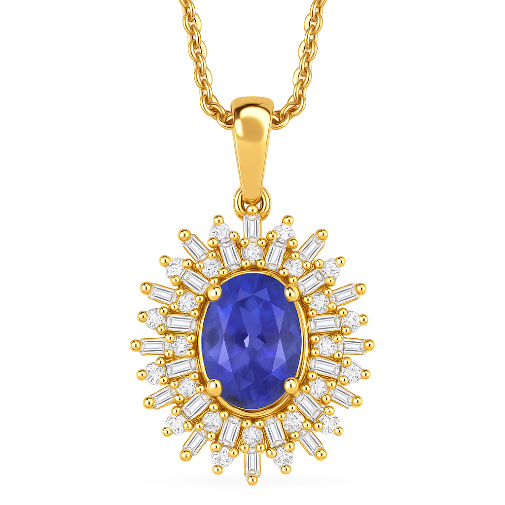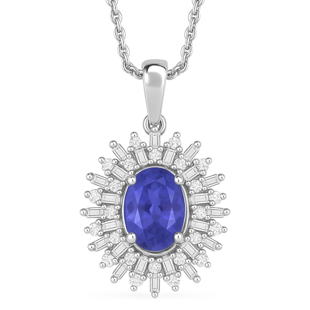 Like the deep waters of a midnight tide, Marina captures a rare and mesmerizing beauty. At its heart glows a velvety violet-blue tanzanite, a gemstone famed for its enchanting pleochroism and found only in the foothills of Mount Kilimanjaro. Framing it, a radiant halo of baguette and round brilliant diamonds fans outward like sun rays dancing on open sea—all cradled in your choice of precious metal: white gold, yellow gold, or rose gold.