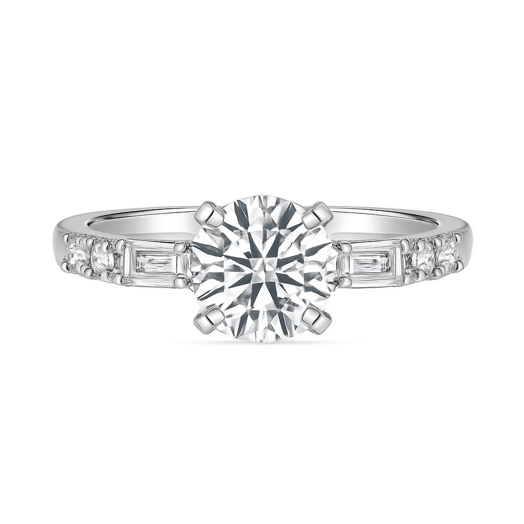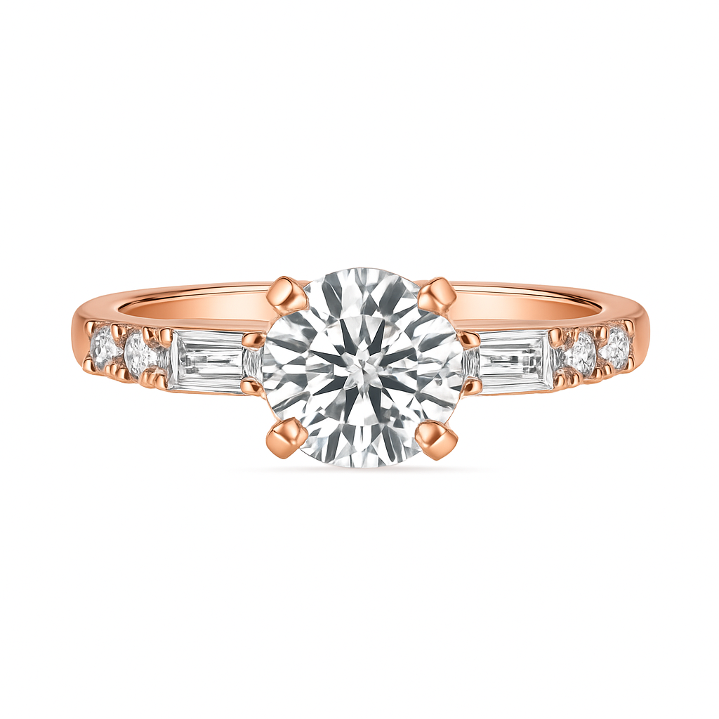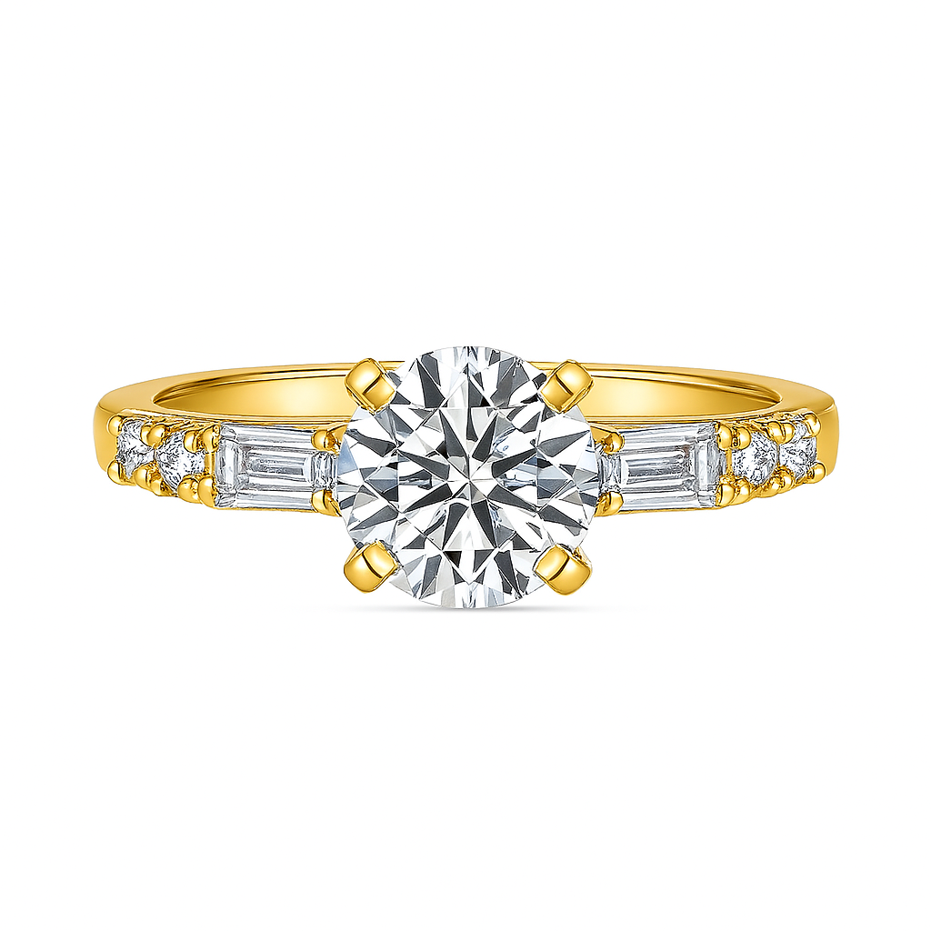 Nireya is for the ones who value meaning over excess—the ones who know that love doesn’t need to be loud to last. With its radiant round center stone, elegant baguette sides, and subtle diamond-alternative accents, Nireya balances timeless design with thoughtful restraint. The setting’s clean lines and soft curves speak to a love that’s steady, strong, and just getting started.