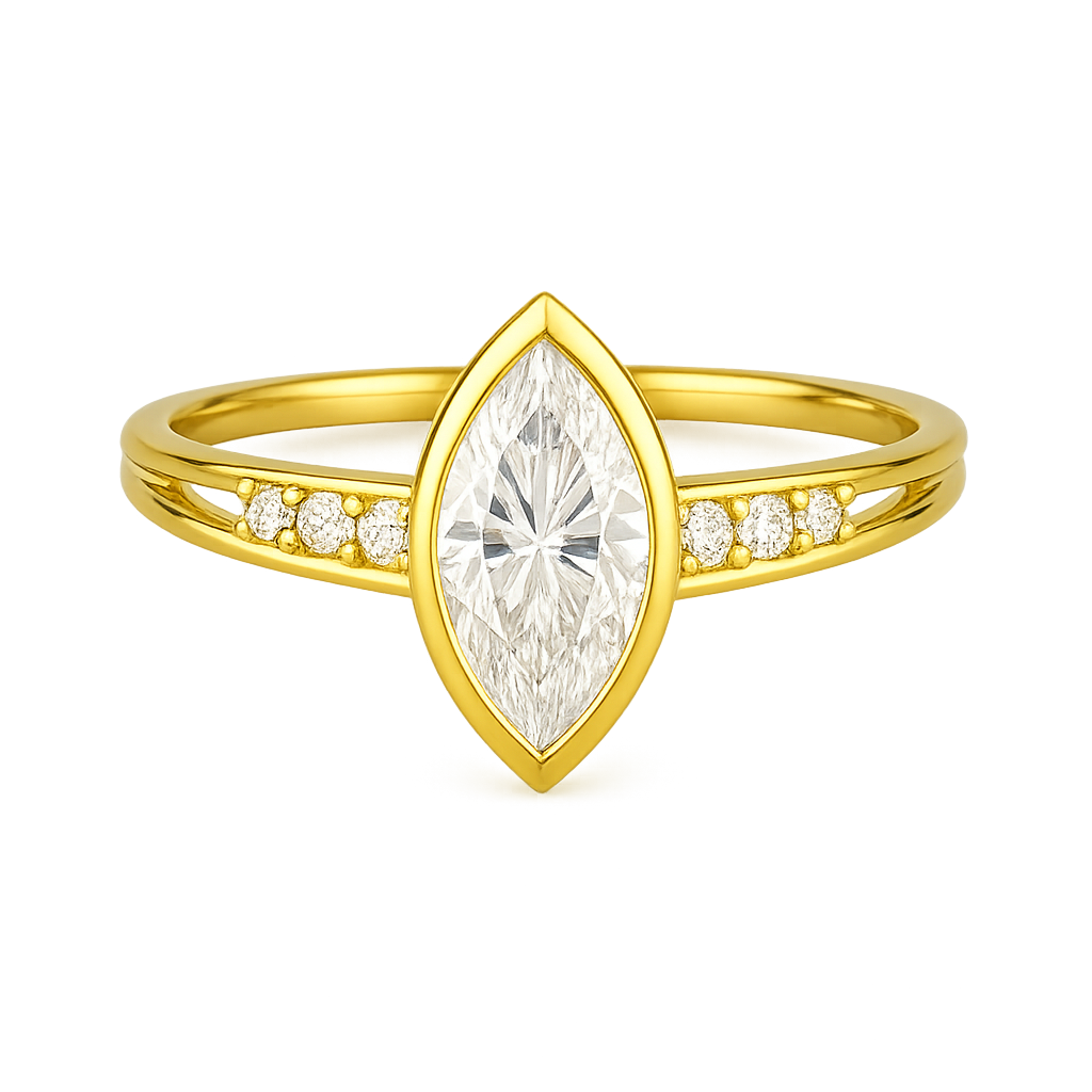 For the one who dreams with her eyes open and believes in building a life of intention, Selene is a symbol of love in its purest, most hopeful form. The marquise center stone mirrors the shape of a new moon—pointed toward the future—with diamond accents tracing your path forward. Crafted in luminous white gold, its silhouette is as graceful as a promise and as enduring as the night sky.