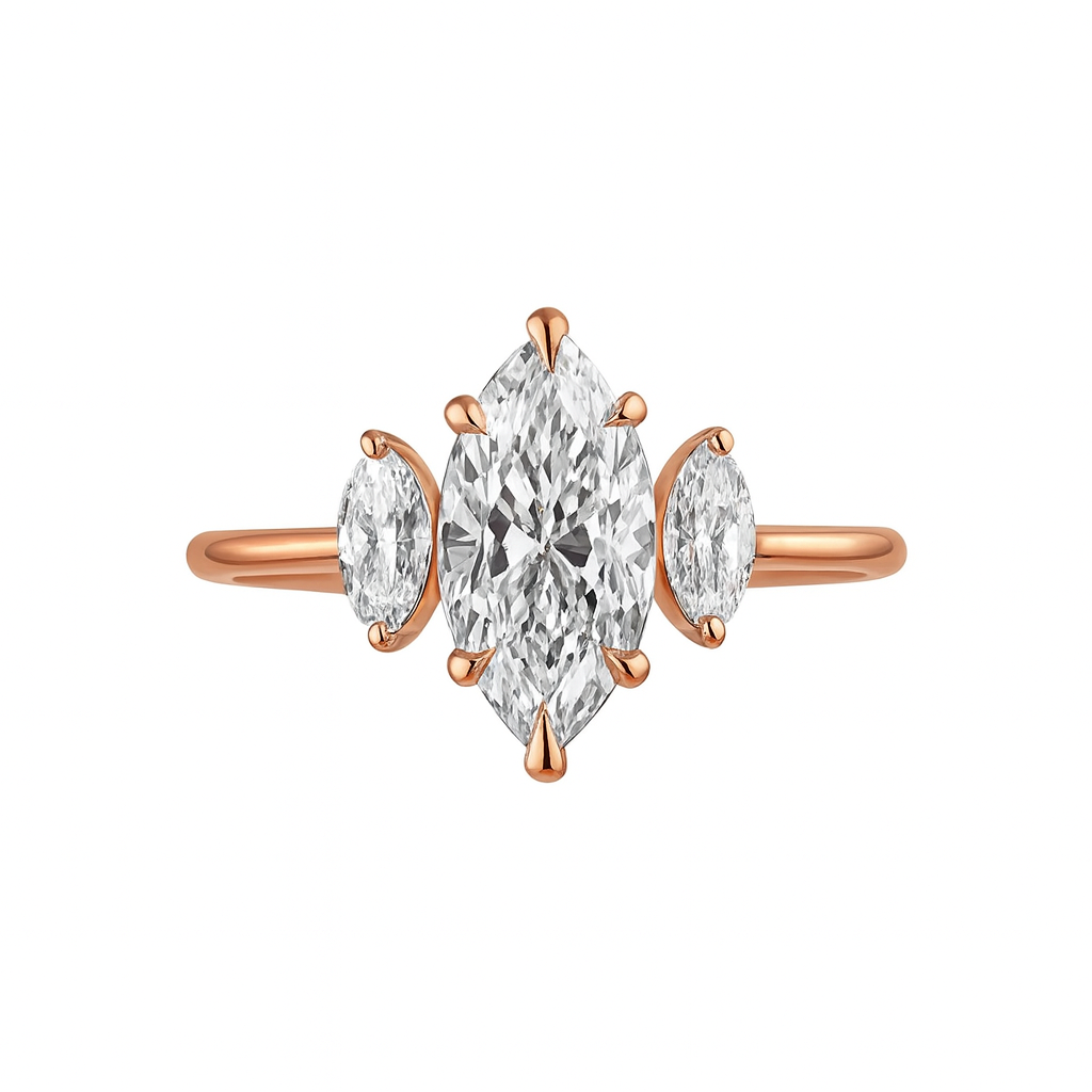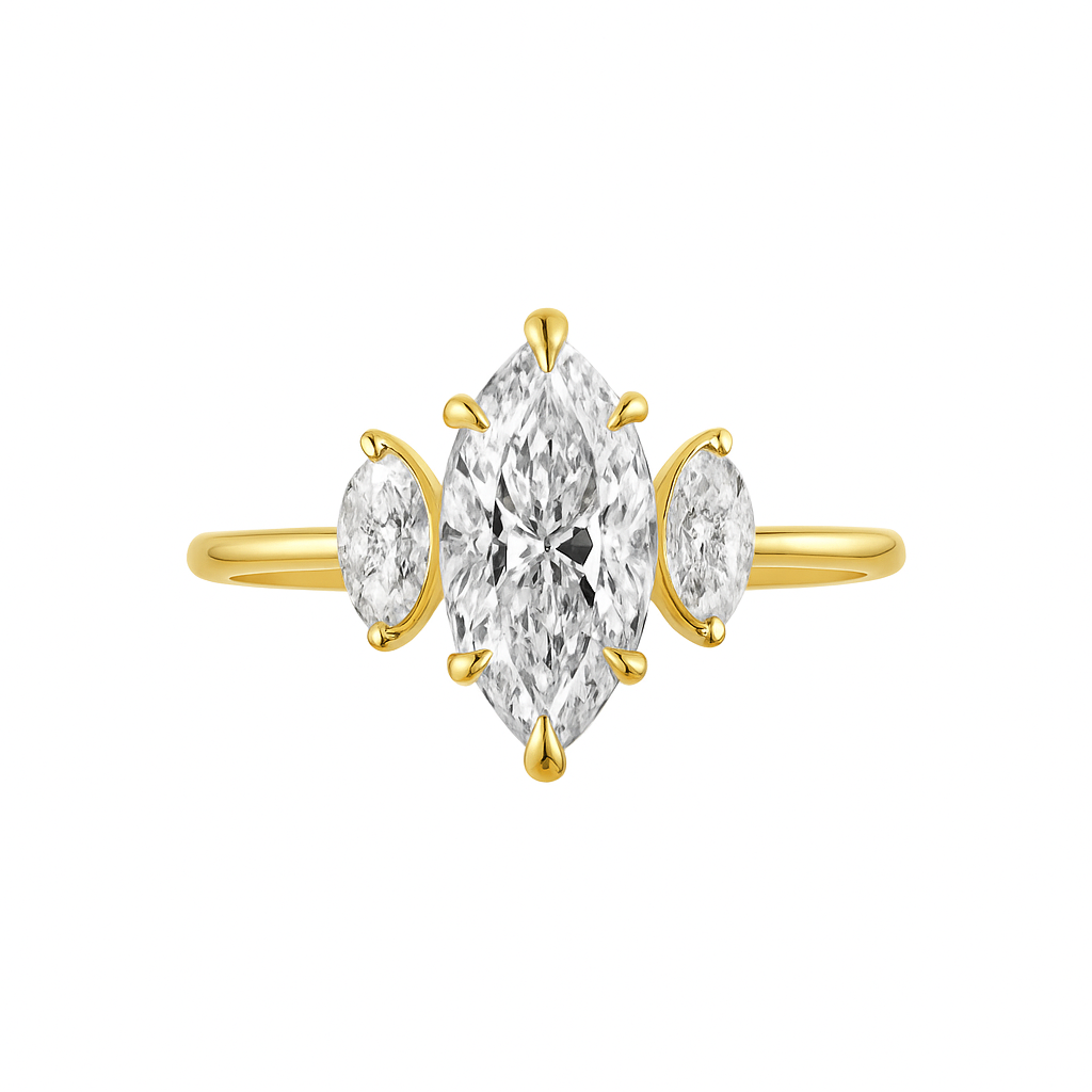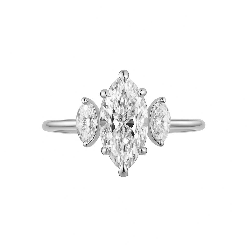 A marquise-cut moissanite takes center stage in Serenelle, framed by two delicate ovals in a minimalist embrace. This romantic silhouette is full of motion and meaning — capturing that pivotal moment when you say yes to your shared future.