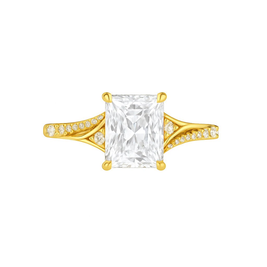For the one who lights up every room, Solara is a radiant tribute to strength, clarity, and luminous love. At the heart of this design lies a dazzling radiant-cut diamond—beloved for its crisp edges, fiery sparkle, and modern glamour. Set in glowing 18K yellow gold, the elongated silhouette of the center stone is both commanding and elegant, framed by two perfectly symmetrical pavé diamond bands that split gently at the shoulders.